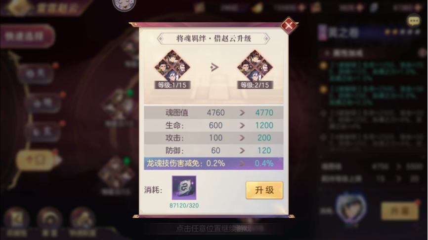 龙纹石其实的使用比较简单,首先前面提到过龙纹石升将魂羁绊可以提供魂图值,将魂羁绊等级越高升级所需的龙纹石越多,因此在魂图技能未满之前还是建议均升,以到达使用最少的龙纹石获得最多的魂图值的目的,在魂图技能都满了以后,可以优先升级四卷当中的黄卷,获得更多的龙魂技增减伤。