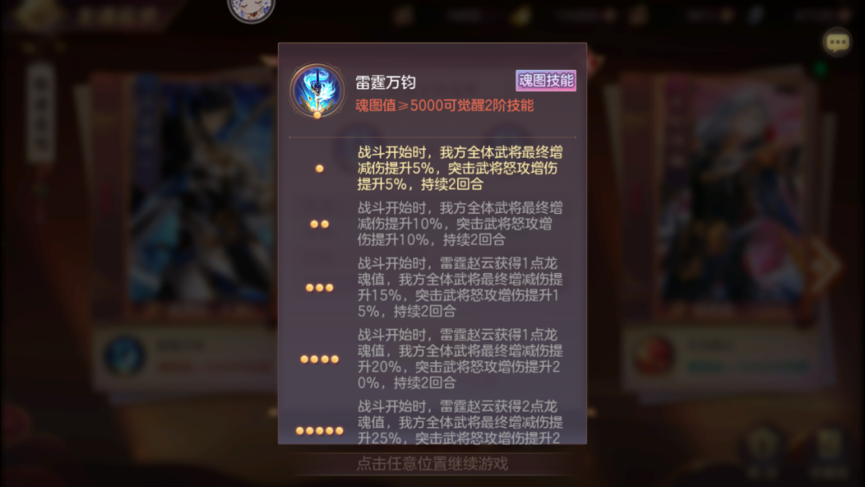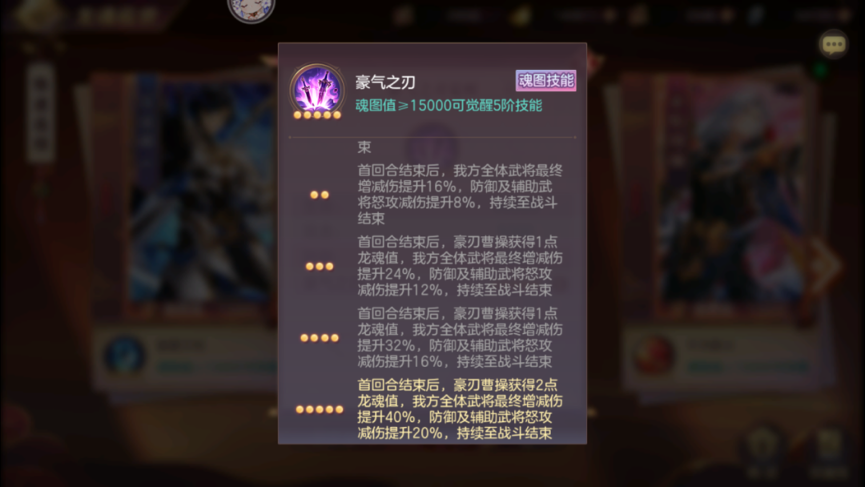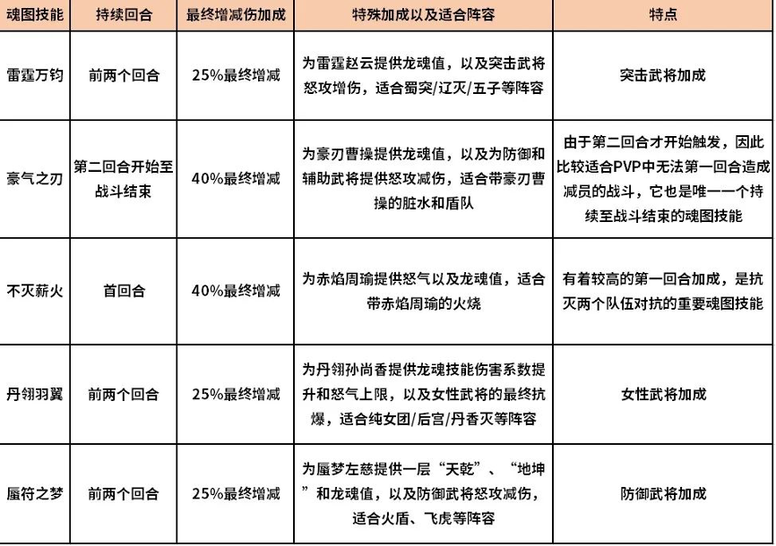 目前来说有5种无双龙魂,即有5种魂图技能,每种魂图技能所带来的提升有所不同,但是主要效果为最终增减伤+特殊加成,魂图技能的等级越高,最终增减伤和特殊加成的提升越多,魂图技能要关注3个方面:第一为生效时间,第二为增减伤加成数值,第三为特殊加成。