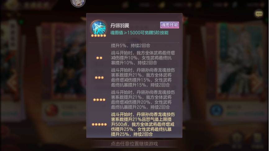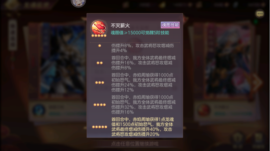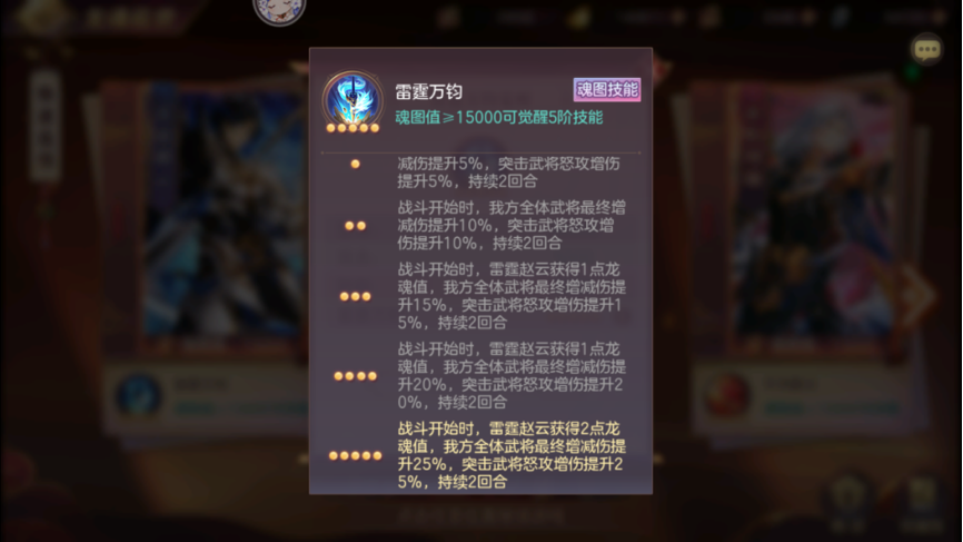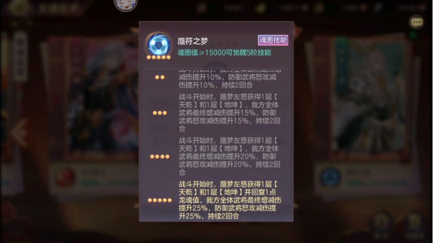 第三部分为魂图技能,使用无双龙魂和龙纹石都会获得魂图值,魂图值可以升级魂图技能,2000、5000、9000、12000、15000分别可以升一次。
