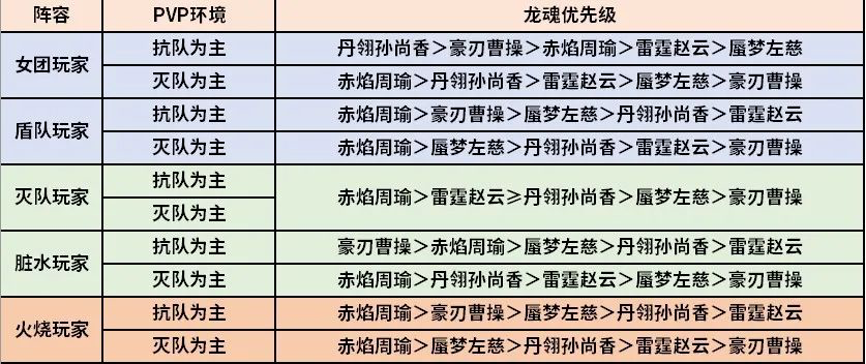 感觉龙魂左慈的优先级应该比曹操低吧,升星技能效果不怎么好,对脏水来说防御武将就一个曹彰,技能相当于第一回合全体25增减伤曹彰25怒攻减伤,曹操虽然是第二回合生效但是除了张辽(没组脏水阵容不确定要不要张辽)其他武将都可以吃到40增减伤和怒攻减伤,个人感觉现版本脏水作为高战才能用的抗队,同等配置的情况下对抗灭队少了开局25增减伤应该不至于被一波清,拖灭队到二回合基本就赢了,个人理解如果有想法错误希望指导