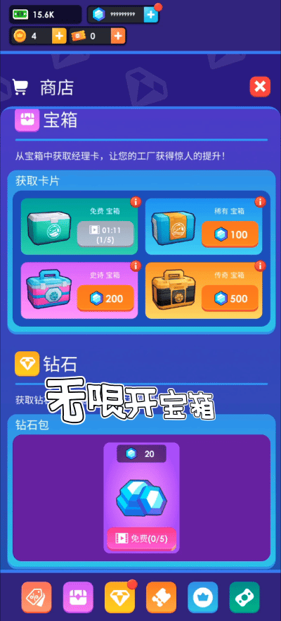 🗣 柠檬安利的这款游戏加入了mod功能,不用看广告就可以获得权益,工厂的启动资金方面不需要过多的担忧,还有就是商店里的宝箱也可以无限的开。