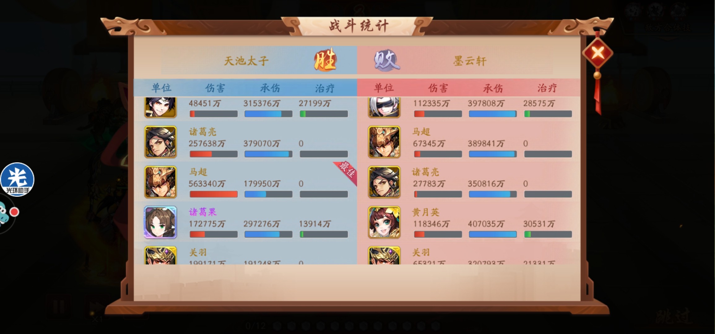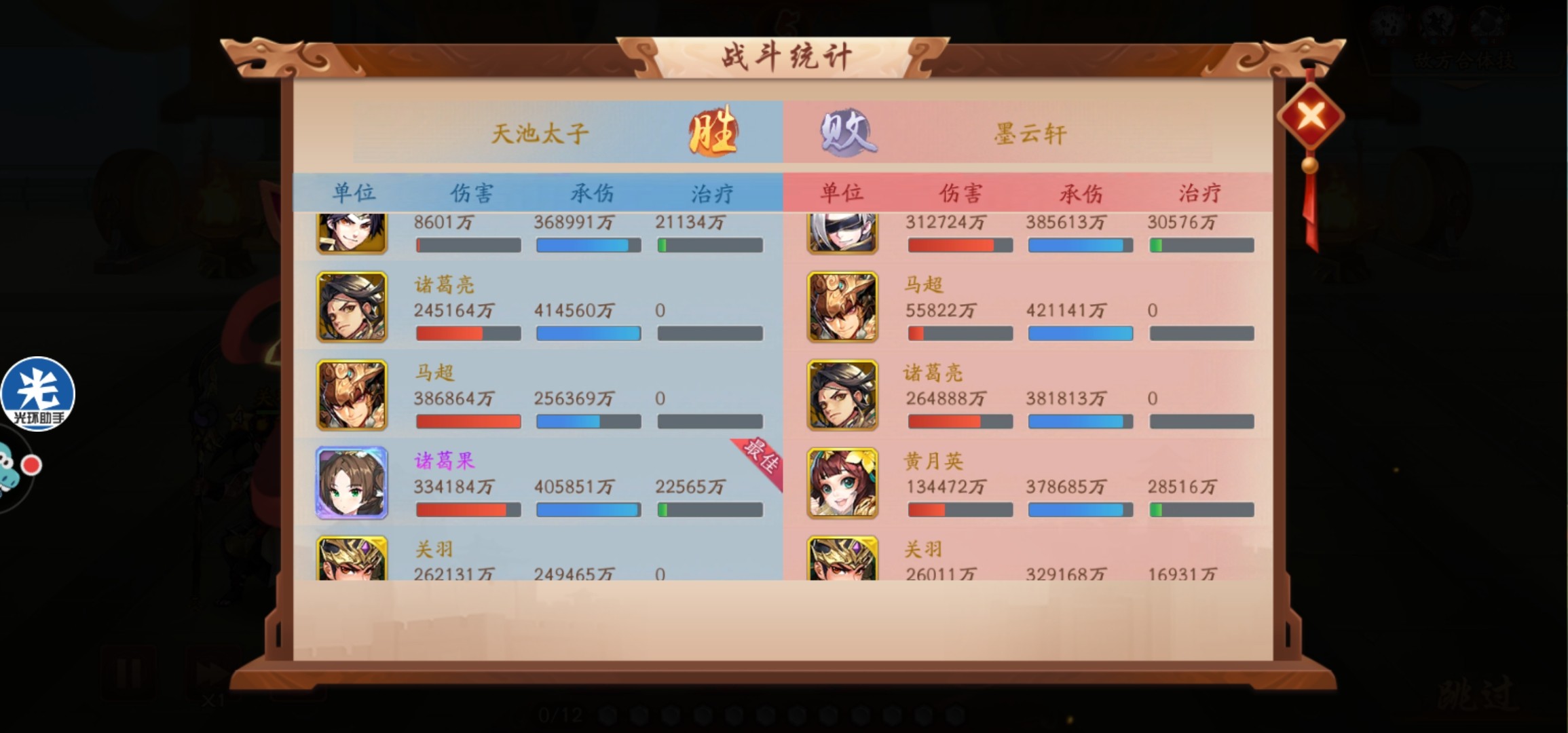 拿最佳的主要是马超、关羽和诸葛果。从统计来看,诸葛果实战中输出和承伤都很高,零星就已经在整个团队里发挥了重要作用,木牛配合马超和关羽续航,流马的补刀也很猛。