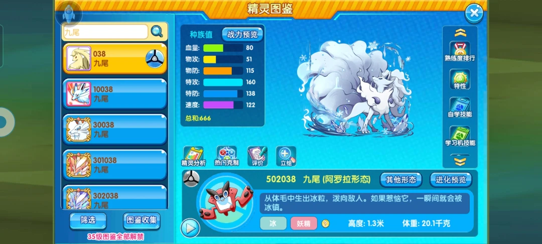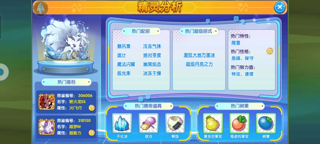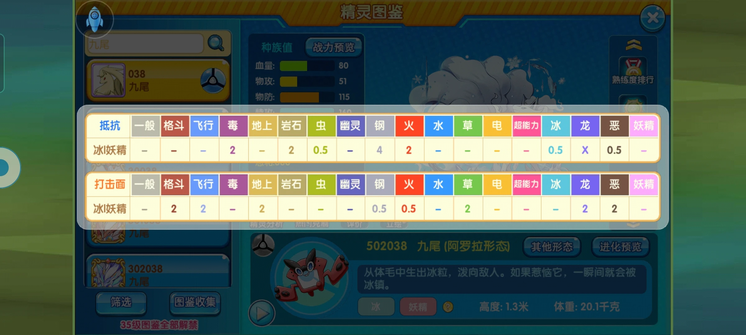 一方面冰系,是抗性最弱的属性,却也是主流的输出属性,拥有最完美控制的属性,而今天这只,虽然并不是最强大的冰系精灵,但却是最强大的降雪精灵,九尾(阿罗拉形态) 拥有冰与妖精的属性。冰与妖精的属性,减轻了格斗的克制,不过四倍弱钢,如果怕对面首位带了钢系精灵,那就换辅助削弱,或者换另外精灵秒了他。