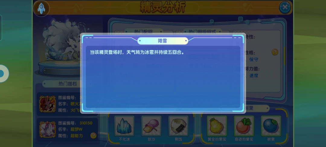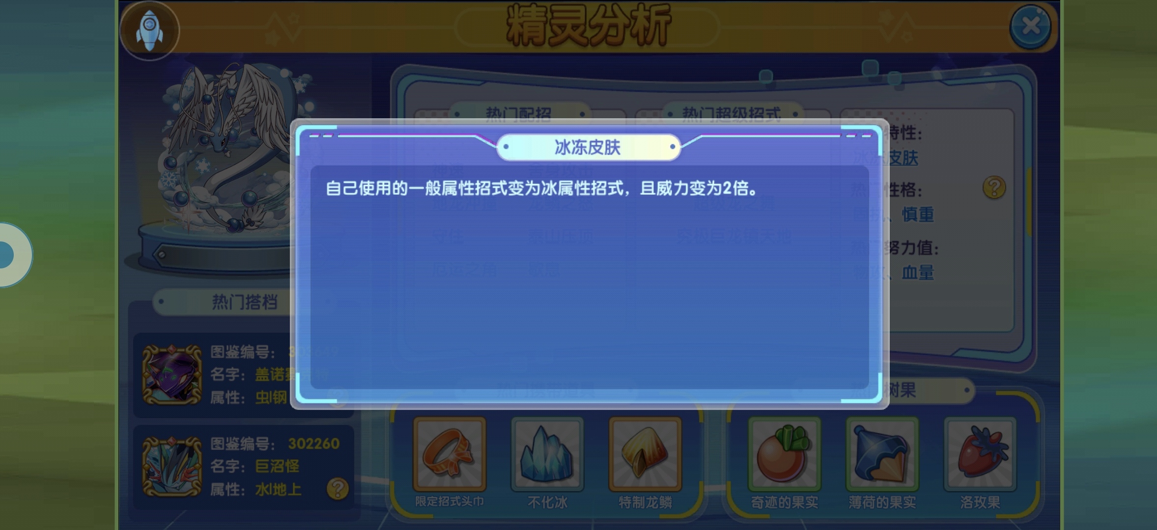 携带物方面推荐剩饭,不化冰甚至限定都是不错的。剩饭因为可以学歇息的缘故优先级不是很高,不化冰配合冰冻皮肤能最大化伤害,限定就不多说了主要是为了打游击战,当然强化玩法就不能带限定。