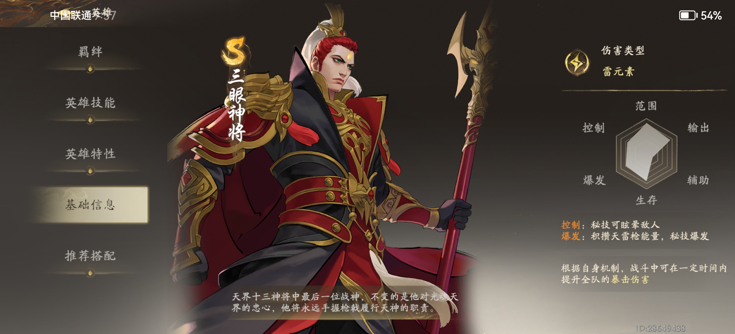 从这个基础能力图上来看,我们的三眼神将是属于一个群体攻击的一个战士类型的英雄。嗯,本身的辅助能力非常的低,其他的能力都是挺不错的。