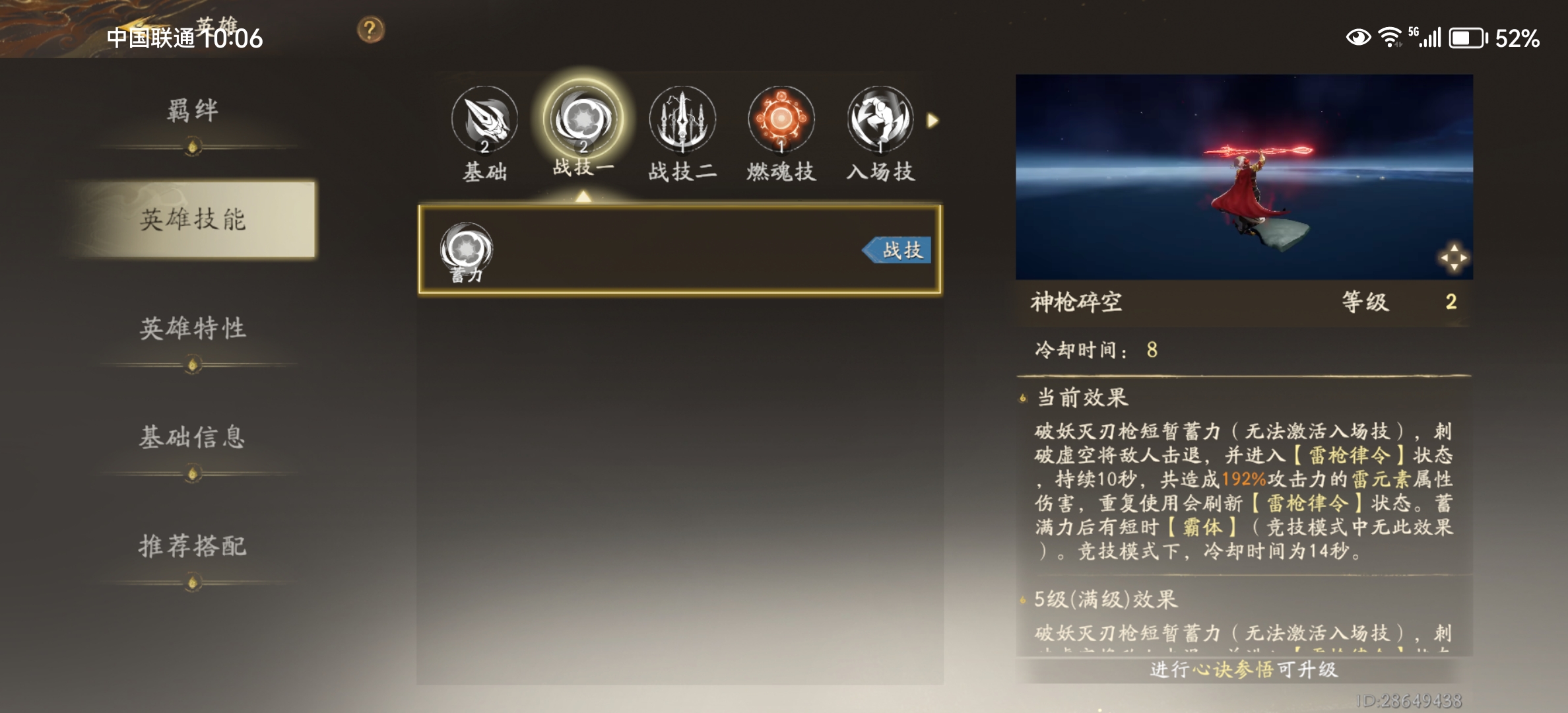 5级(满级)效果处于【雷枪律令】状态时可释放,腾空而起挥舞破妖灭刃枪全力下砸,地面大范围枪阵突起,将前方敌人浮空,造成426%攻击力的雷元素属性伤害,战技全程【霸体】。释放后消耗所有【天雷枪能量】并且【雷枪律令】状态消失,【天雷枪能量】将加强此战技效果。【天雷枪能量.1】:额外引发一次天雷攻击,造成183%攻击力的雷元素属性伤害。