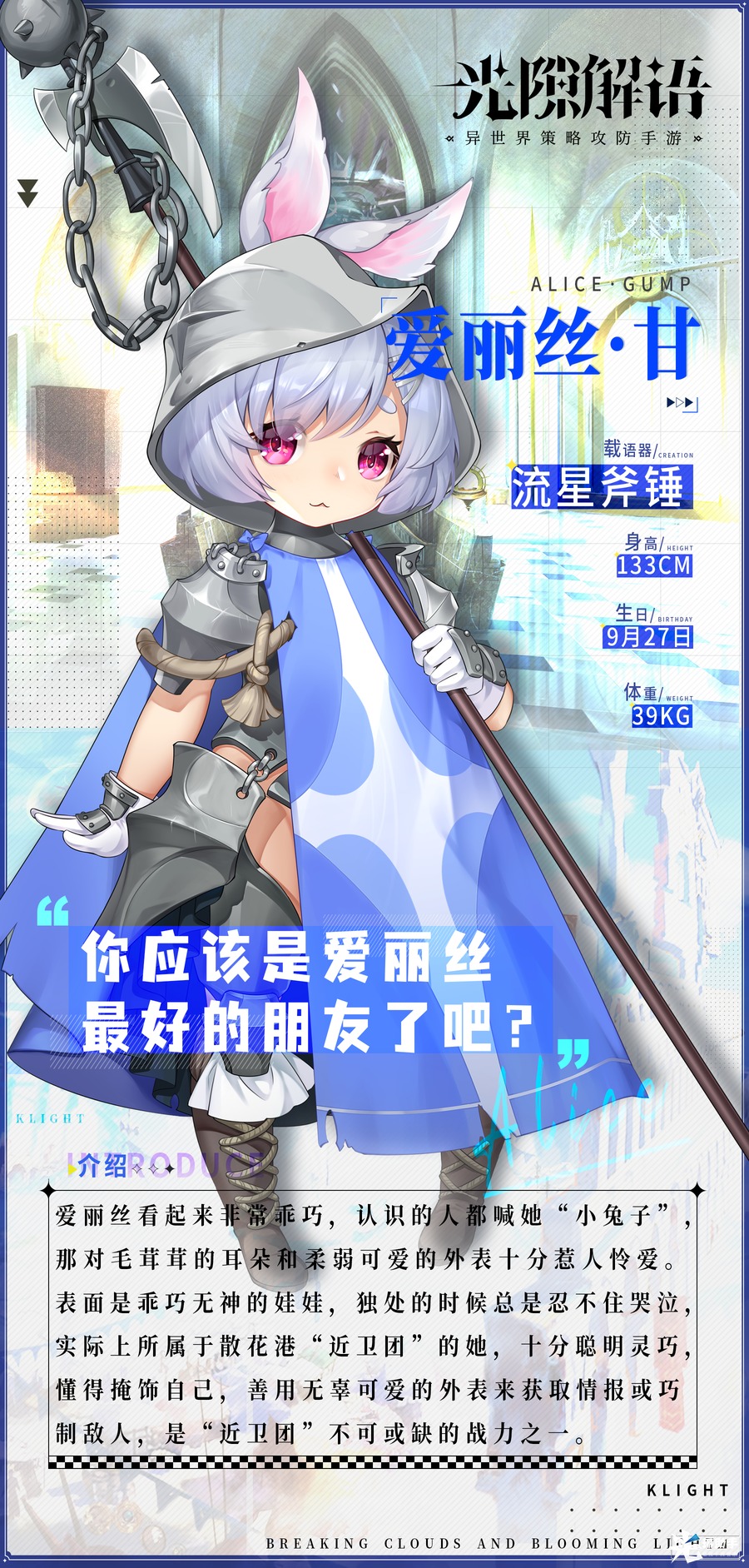 “你好,我叫爱丽丝,来自散花港,是只…可爱的小兔子,你呢?”