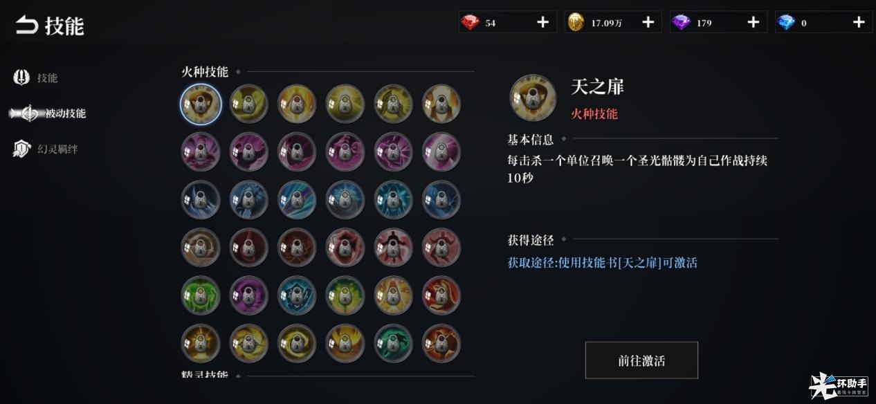 精灵技能:通过解锁不同精灵来激活的技能,不同精灵拥有着效果各异的被动技能,需要天启收集对应的精灵才能解锁。目前精灵获取途径只有众星试炼、助战商店和精灵宝藏,其中众星试炼为主线任务,需要玩家到达相应的等级才能够开启,精灵宝藏则是通过抽奖随机来获取精灵,助战商店的兑换方式和火种技能一样,都需要通过消耗助战点进行兑换。