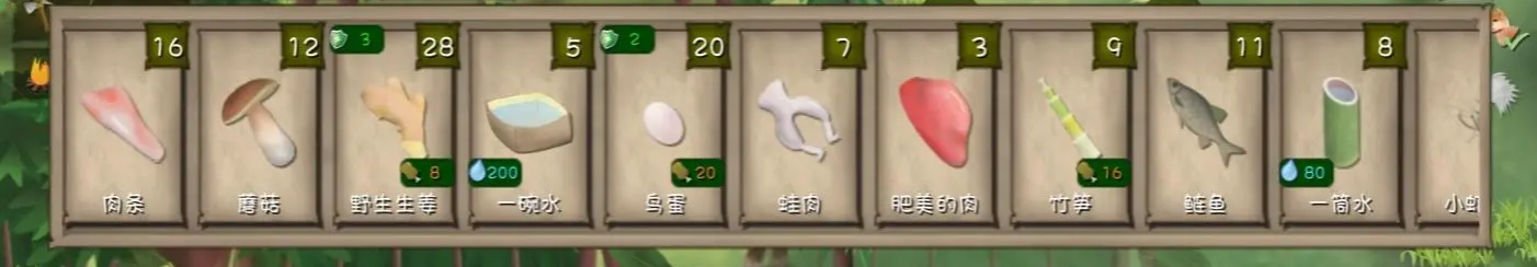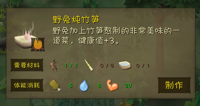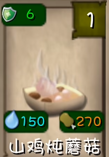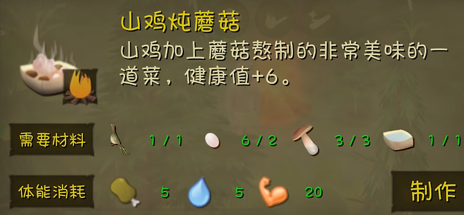 就是说捉到的野鸡,不要烤!那会丧失野鸡的鲜美,简单收集1只山鸡、2个鸟蛋、3个蘑菇和一个树皮碗,就能来上一锅“山鸡炖蘑菇”;