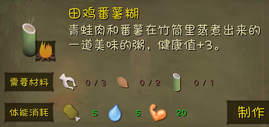 所谓“美食荒野”,就是说捉到的青蛙,不要烤!那会丧失青蛙的鲜美,简单的收集1个竹筒、2个番薯、3只青蛙,做一个美味的“田鸡番薯糊”;