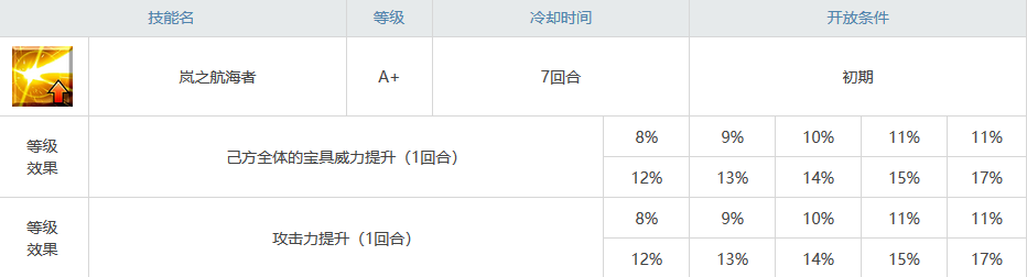 技能介绍一技能暴风雨的航海家,这其实就是每个船长必备的技能之一了,没什么好谈的,宝具威力和攻击力提升。