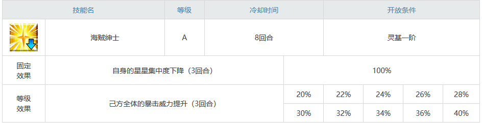 二技能海盗绅士,这个技能正符合巴沙洛缪•罗伯茨的形象,以自己暴击星集中度下降为代价提升己方全体暴击威力,一个中规中矩的辅助技能。