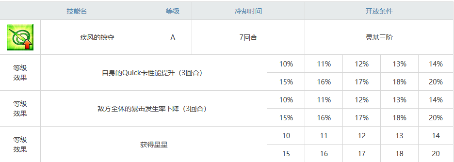 三技能疾风掠夺,己身最强的技能,提升自身绿卡性能,敌方暴击发生率下降,获得大量暴击星。