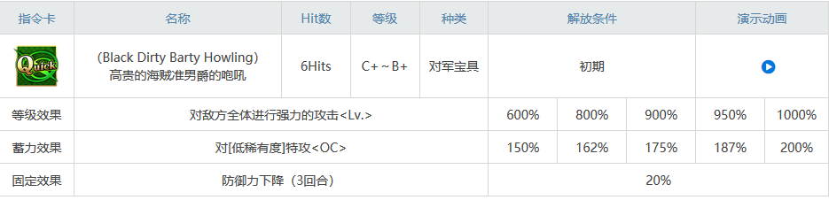 高贵的海盗准男爵之咆哮,对敌方全体进行强力攻击,对低稀有度特攻,防御力下降。