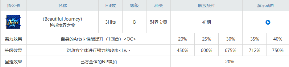 宝具超越边界的存在提升自身蓝卡性能对敌方发动超强大的攻击,附带己方全体np增加固定20。