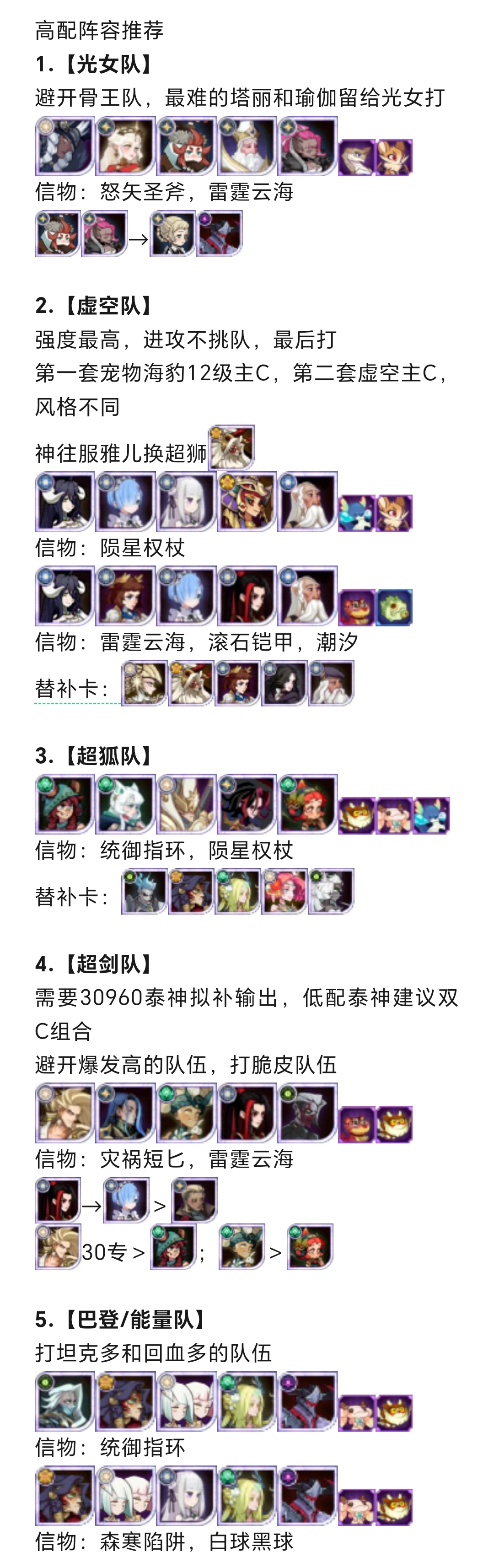 下面分享一套宠物共鸣6的平民版乱时五队阵容,只需要一个30960的超狐即可,替换方案可以参考上方,