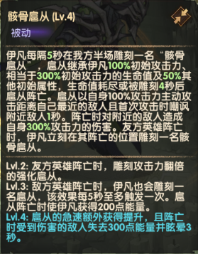 每隔5s/友军阵亡/敌军阵亡时,骨匠都会雕刻一名“扈从”,扈从会对敌方敌方进行攻击与嘲讽控制,阵亡时会额外造成伤害,且扈从阵亡时骨匠会获得200点能量。