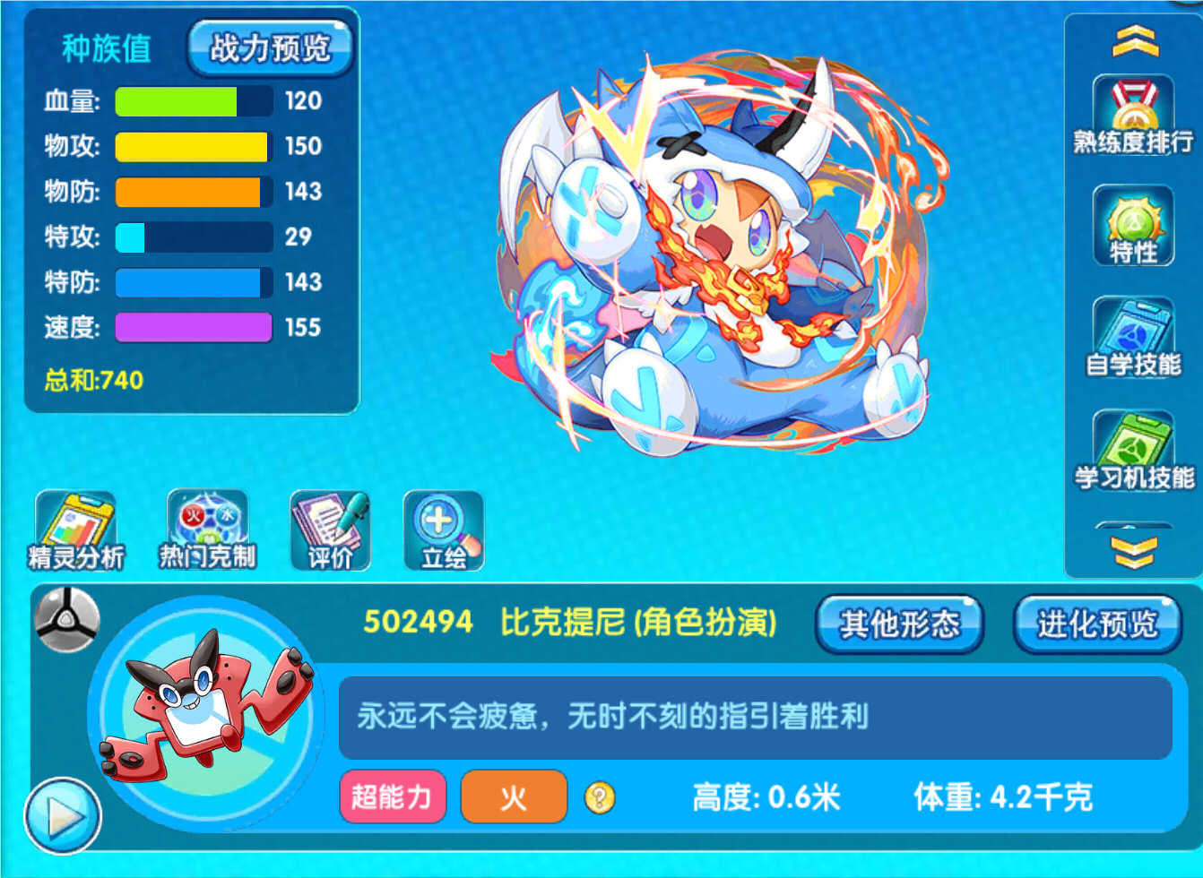 精灵配置说明:从面板上来看是一个高速高攻的宠物,由于自身的特性,可以让自身的物攻翻倍,同时使用的技能是无限所以我才在技能方面推荐了两种,第一种就是用来打野外副本的,对于新人玩家来说很有必要搞一下,不过超进化之前的种族值就是一个最差的水桶腰配置,打不出任何的优势。