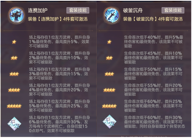 破釜和连携的主要效果都是对局过程中所提供的Buff(均不可驱散)且同时涉及了“最终减免”这个属性 而且巧合的是(更可能是策划有意为之)同星级的情况下 最终减免的量也是同样的(无双同为30%最终减免)
