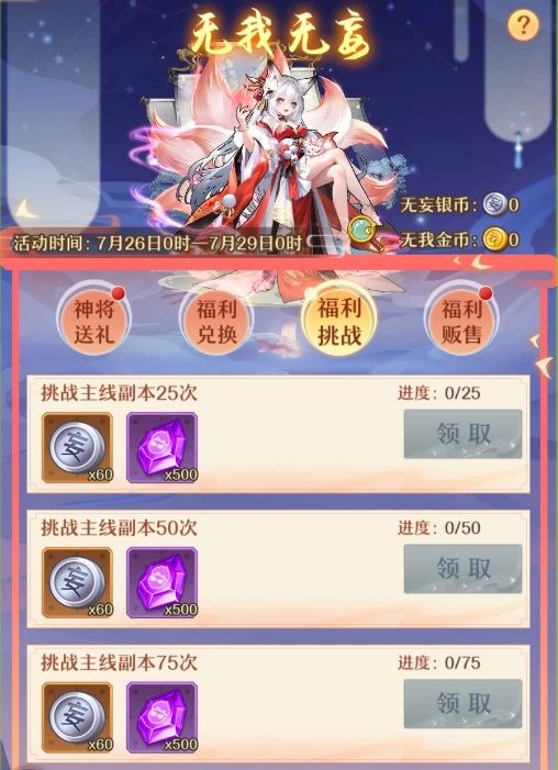 活动期间,完成挑战主线副本和竞技场,达到一定次数即可获得将魂,威望,无妄银币奖励。