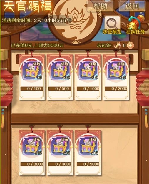 活动期间,少年们可通过游戏充值或完成指定任务获得求运签进行求运。当求运值达到一定进度时,就能领取天金赐福宝箱一。