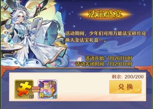 活动期间,少年们可以用万能法宝碎片来兑换天金法宝礼盒一,走过路过不容错过~