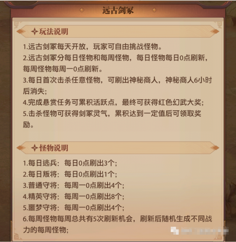 远古剑冢每开放,主公可自由选择怪物挑战。怪物分为每日怪物和每周怪物。每周怪物每周一0点刷新,每日怪物每日0点刷新,最多可以累积12个。每日首次击杀任意怪物,可刷出存在6小时的神秘商人。