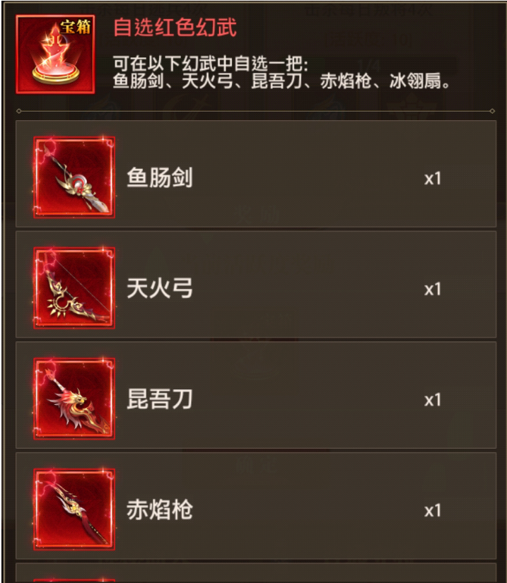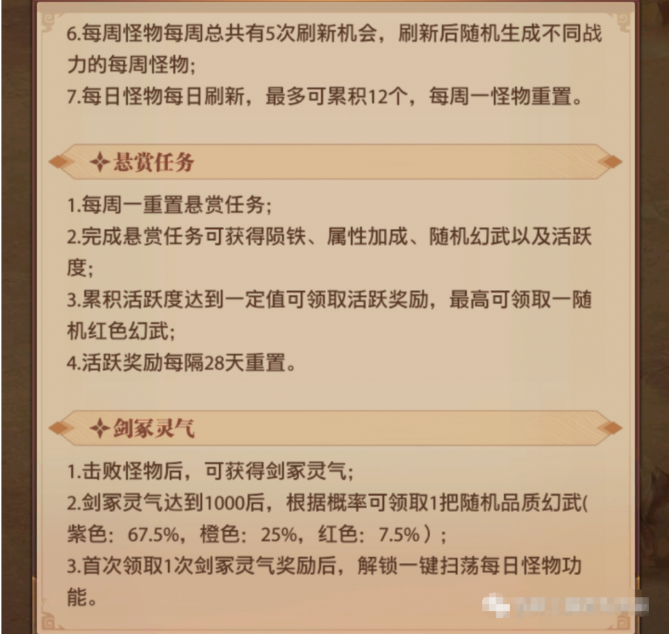 完成悬赏任务可累计活跃点,最终可获得红色幻武大奖。击杀怪物可获得剑冢灵气,累计达到一定值后可随机获得一个品质幻武宝箱。