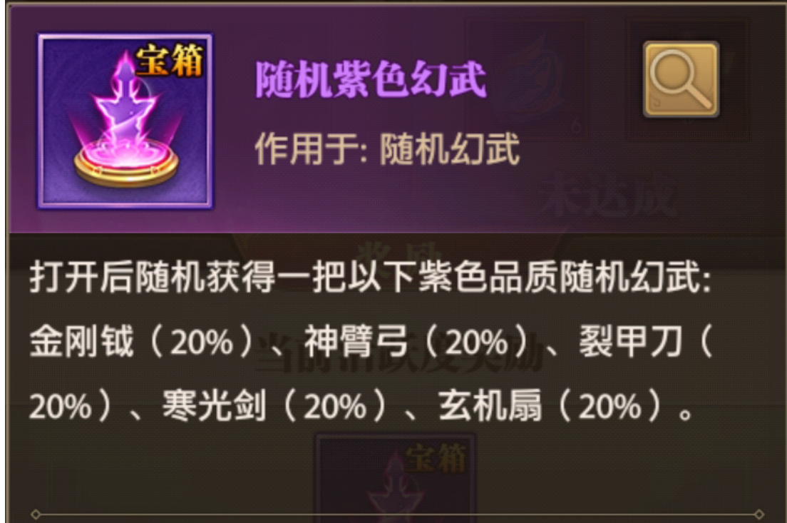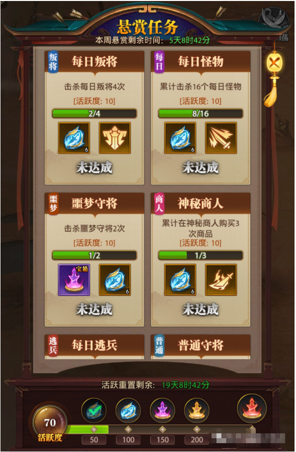 悬赏任务每周周一重置,完成悬赏任务可获陨铁、本周Buff、随机紫色幻武、活跃度等奖励,陨铁是提升幻武等级的必须品,本周Buff能提升主公在远古剑冢的属性,累积活跃度达到一定值可领取活跃奖励,最高可领取自选红色幻武。