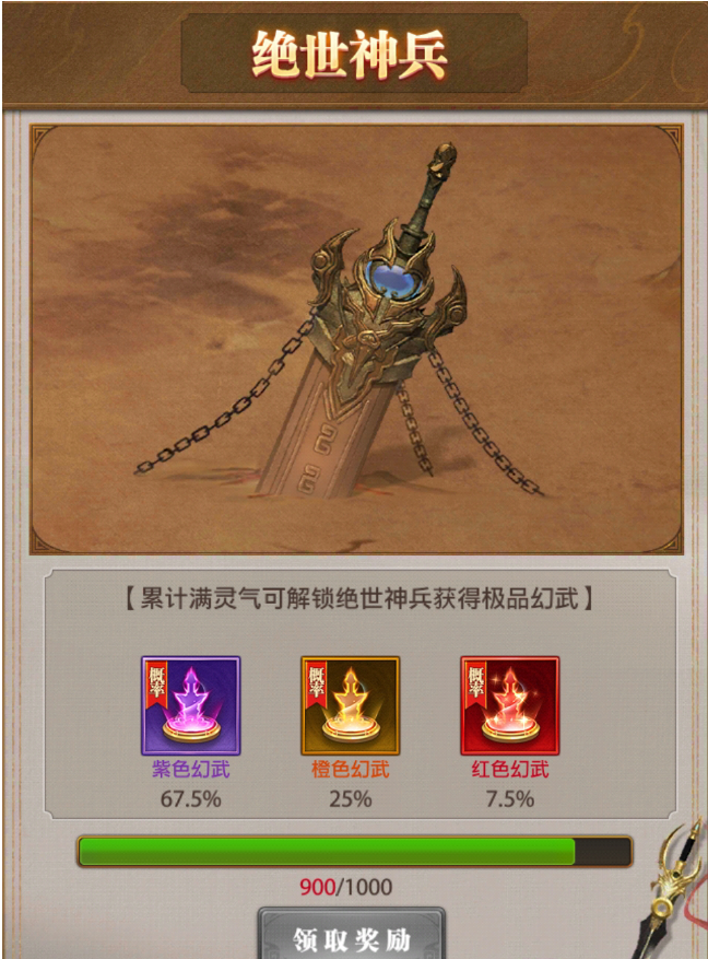 击杀怪物可获得剑冢灵气,累计达到一定值后可领取奖励。难度越高的怪物击败后获得的剑冢灵气也越多。当获得1000剑冢灵气后可随机获得一个幻武宝箱。