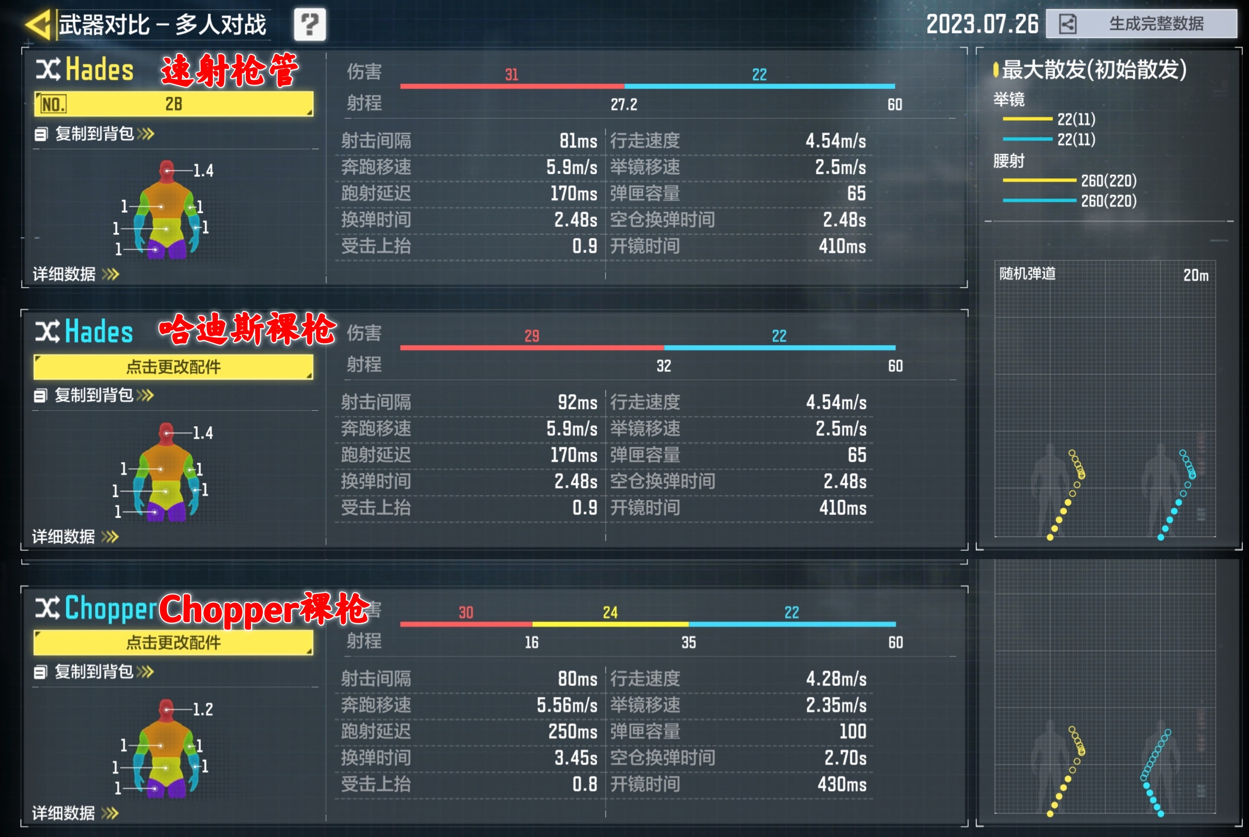 在当前版本中,哈迪斯依然拥有2段射程,稳定伤害由全身4枪降低为全身5枪!如果裸枪和Chopper对比,虽然头部伤害倍率虽然更高,但爆发概率依然一样,且射速大大不如,似乎没啥优势!但哈迪斯佩戴速射枪管后一切都不一样了,射击间隔仅差距1ms,且一段射程伤害31点,爆头一枪即可3枪带走!因此想要发挥哈迪斯优势,核心配件速射枪管一定不能少!