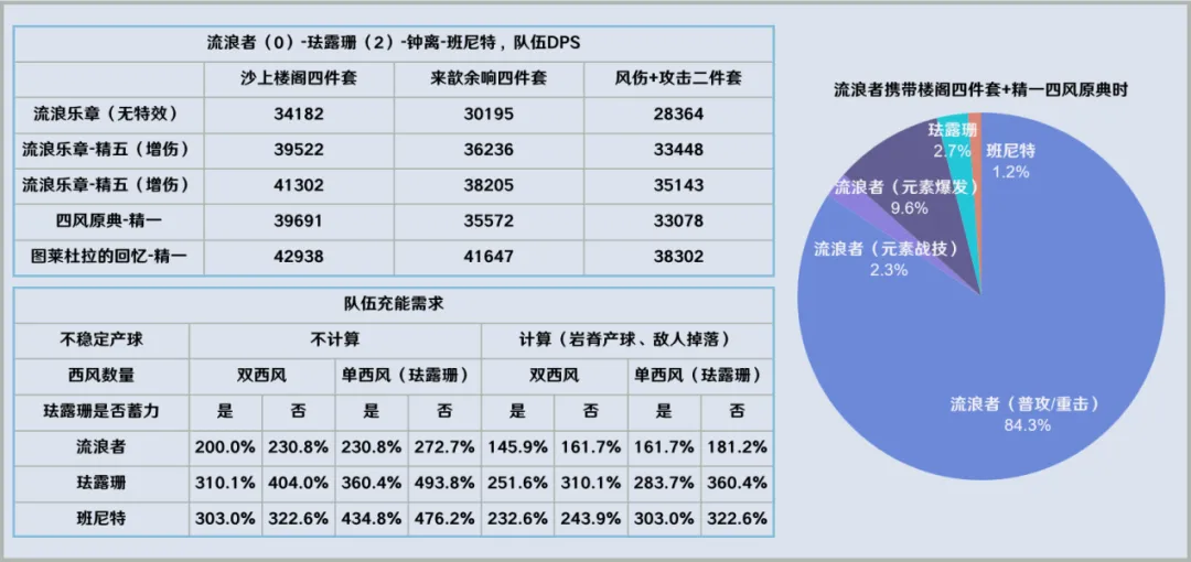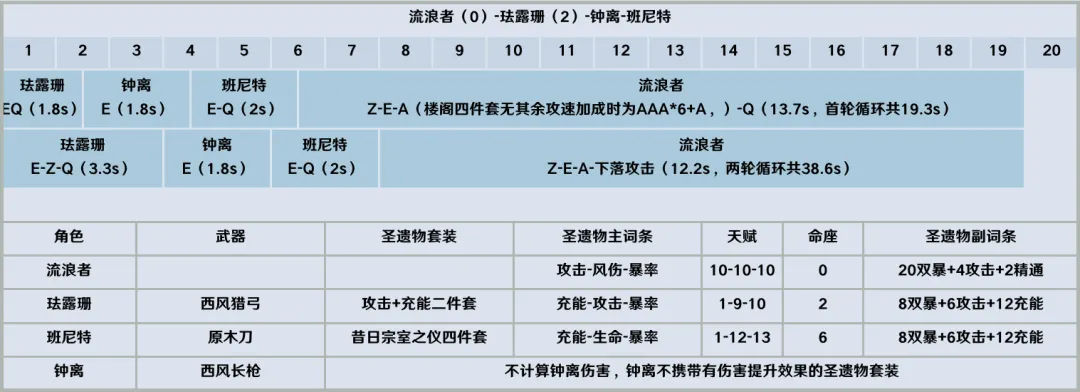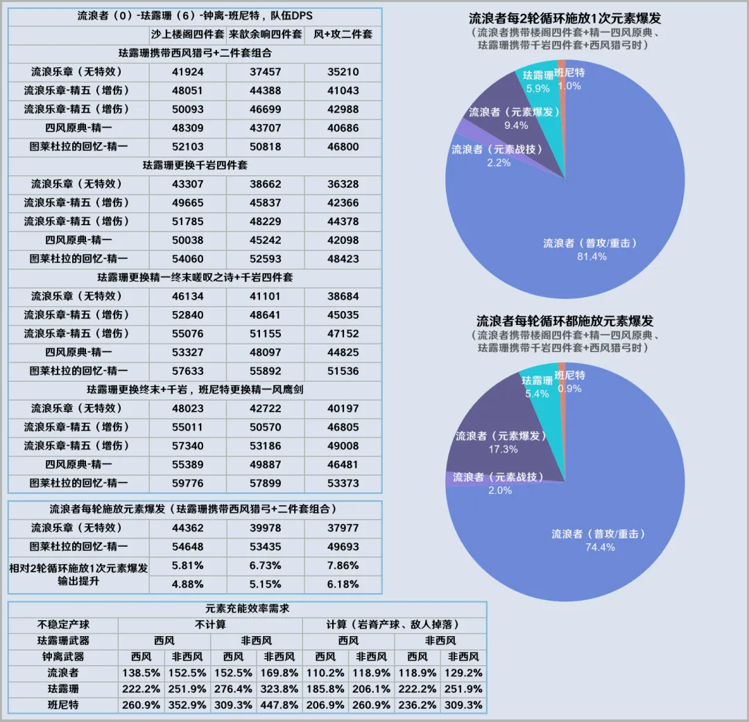 此外也计算了每轮循环都施放爆发的情况:携带6命珐露珊后部分情况下流浪者可以做到1轮完成充能,此时2轮循环总时长计38.6秒(2个相同的施放元素爆发循环)。