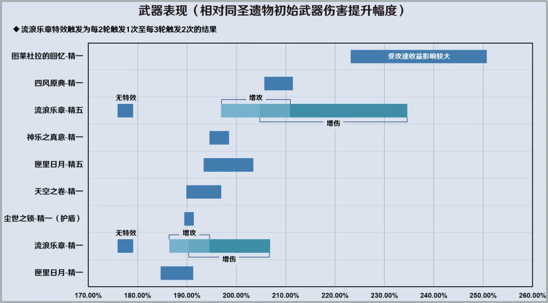 武器:触发增伤的精五流浪乐章、四风原典、图莱杜拉的回忆,相对不触发特效的流浪乐章提升在20%前后,相对匣里日月、天空之卷等较适配武器提升也有约10%至20%。