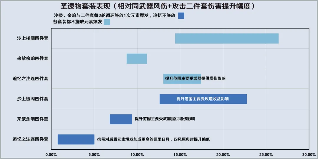 四件套组合:沙上楼阁四件套对比二件套组合提升12%-20%(主要受攻速加成影响,如拟定情况下非攻速武器携带沙楼套由AAA*5+AA提升至AAA*6+A,提升约20%,携带精一图莱杜拉的回忆时由AAA*6+A提升至AAA*6+AA,提升为12.1%);沙上楼阁四件套相对来歆余响四件套提升约3%-13%,图莱杜拉也因为拟定情况下的攻速与增伤收益原因是沙楼提升最低的武器;实战中攻速收益不固定,可能因为闪避、染水、提前结束普攻等情况改变,攻速影响通常在上述范围内。