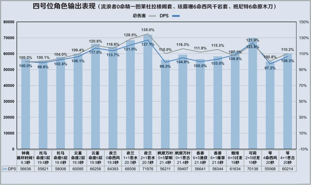 循环时长会根据角色技能时间调整,其中枫原万叶和香菱都因为充能需求在循环末尾施放了额外的技能;枫原万叶、香菱、琴为在班尼特领域内施放技能且占用了较多增益时长,为流浪者元素爆发可以获取领域增益流浪者在对应队伍中少施放2段普攻(1、2段),并减少0.9秒循环时长。