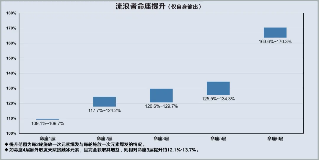 珐露珊命座6层带来的提升大致可以相当于2珐部分的一件关键配装提升,达到相同输出对流浪者配装的需求有直接降低。