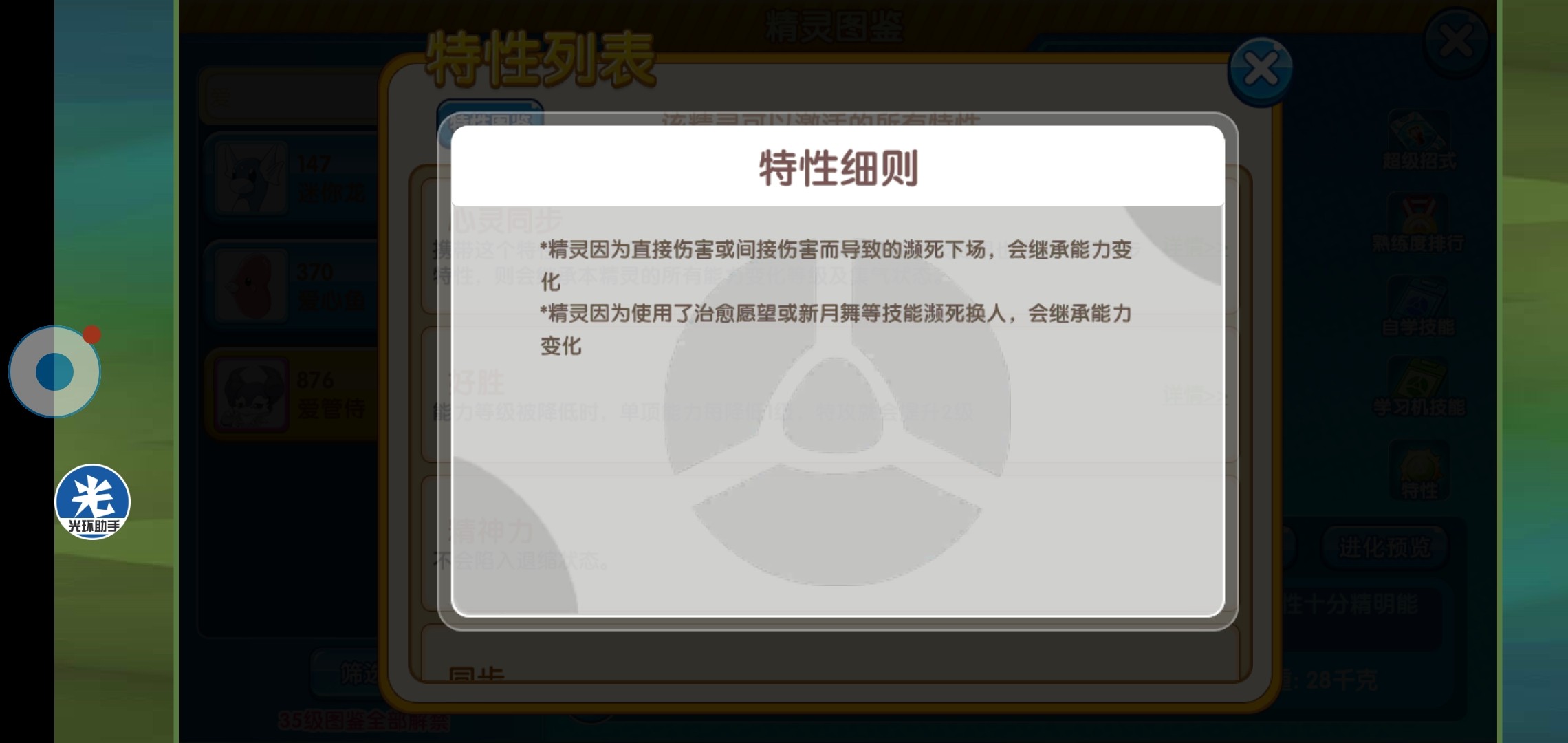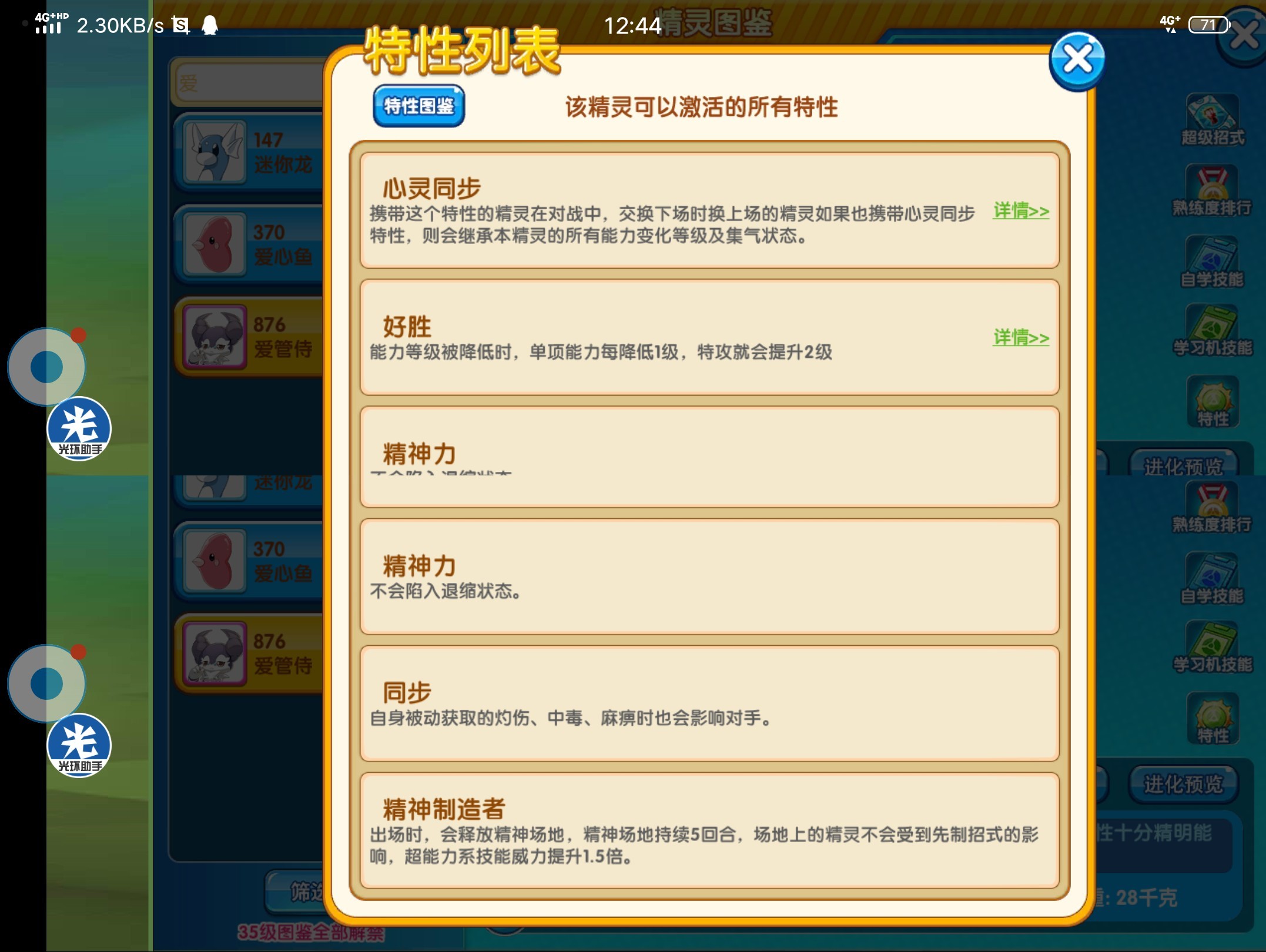 它有五个特性,但是最主要用到的还是新特性心灵同步,其他特性作用不大,不过如果玩单只,雌性可以用同步,吃状态同步给对手,自身用芳香治愈,雄性可以用精神制造者。增强打击能力。当然还有好胜,但是由于技能限制,这个强化玩法暂时没法玩。