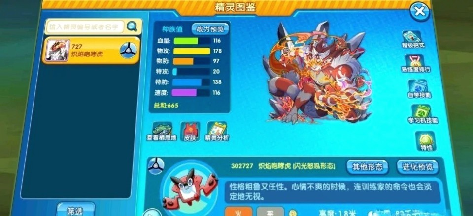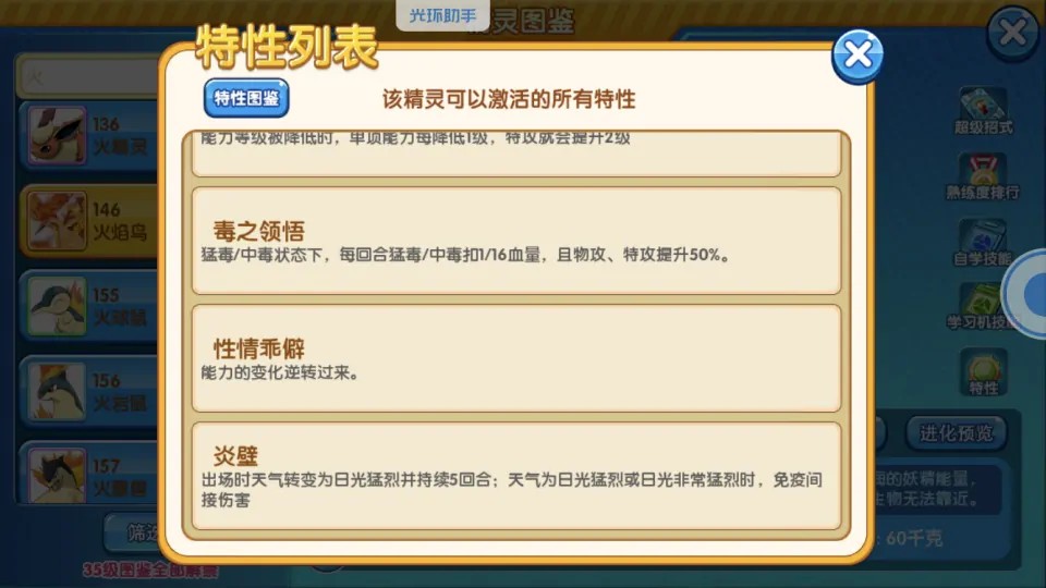 咆哮燃烧:上场时,能够获得换下场时的那只精灵的部分上升的能力强化的效果。