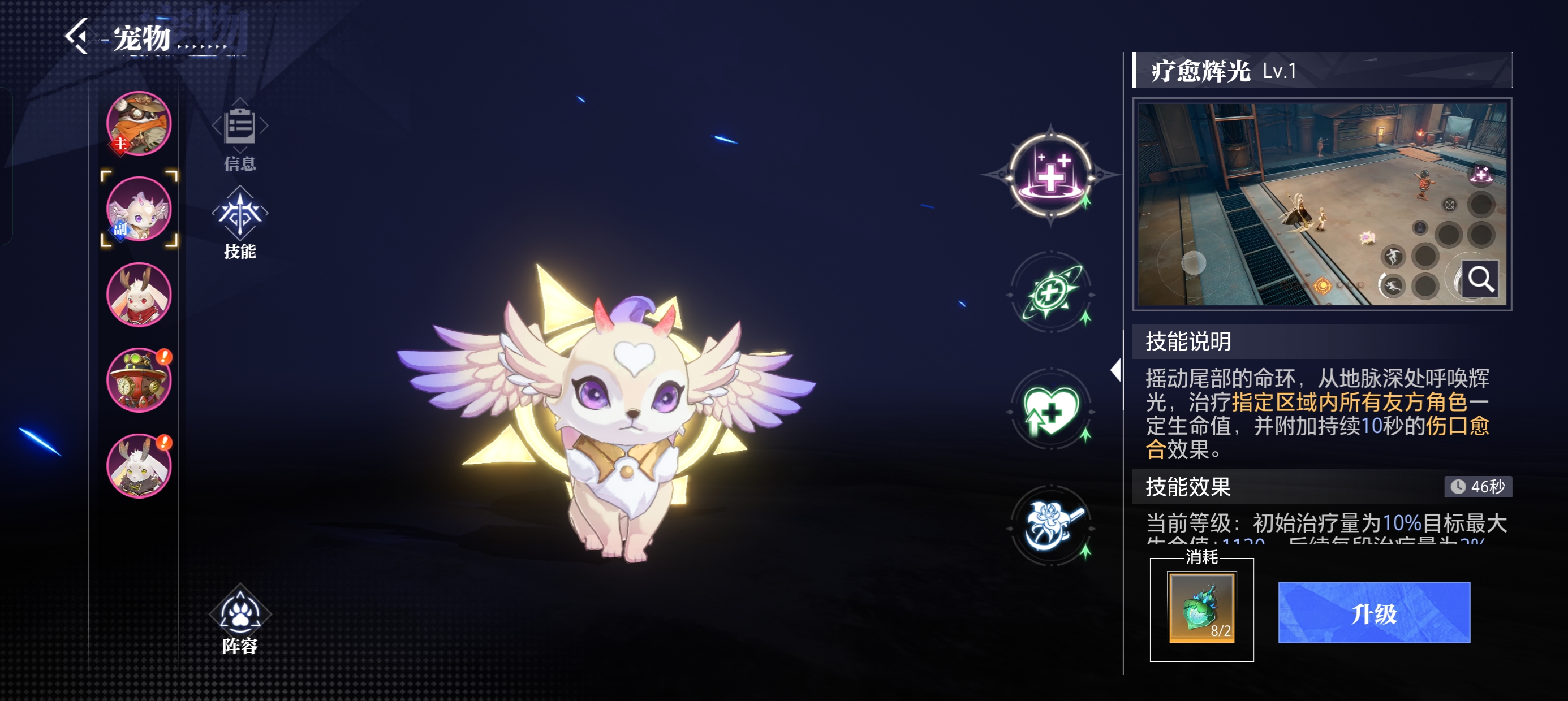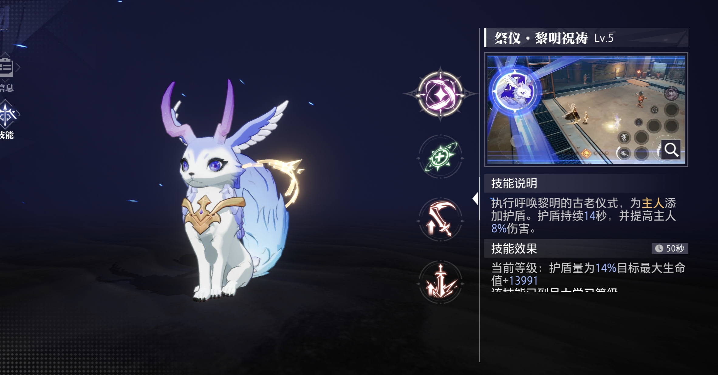 大招可以主人添加护盾并且提高主人百分比的伤害,强化后的大招可以给队友也添加护盾。总体来说是个非常全面的宠物,强烈推荐培养!