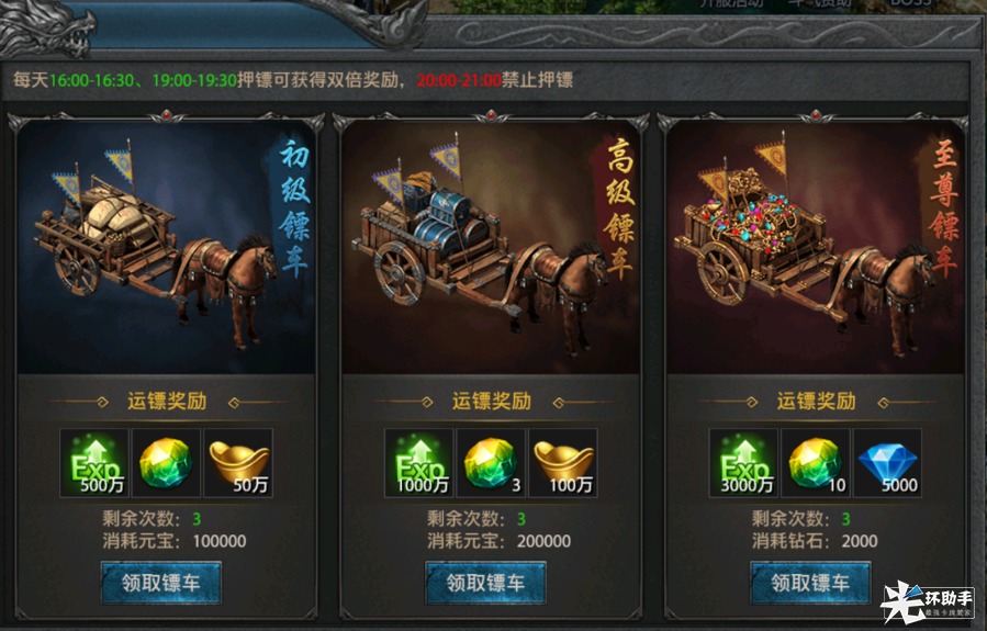 押镖玩法勤勉搬运的后辈君发布于 2023-07-31关注规则说明1、每天有3次护送镖车次数2、每天16:00-16:30、19:00-19:30押镖可获得双倍奖励3、20:00-21:00禁止押镖4、押镖可获得大量鸿蒙紫气、五行奇石、元宝,押送的镖车品质越高,奖励越丰富!