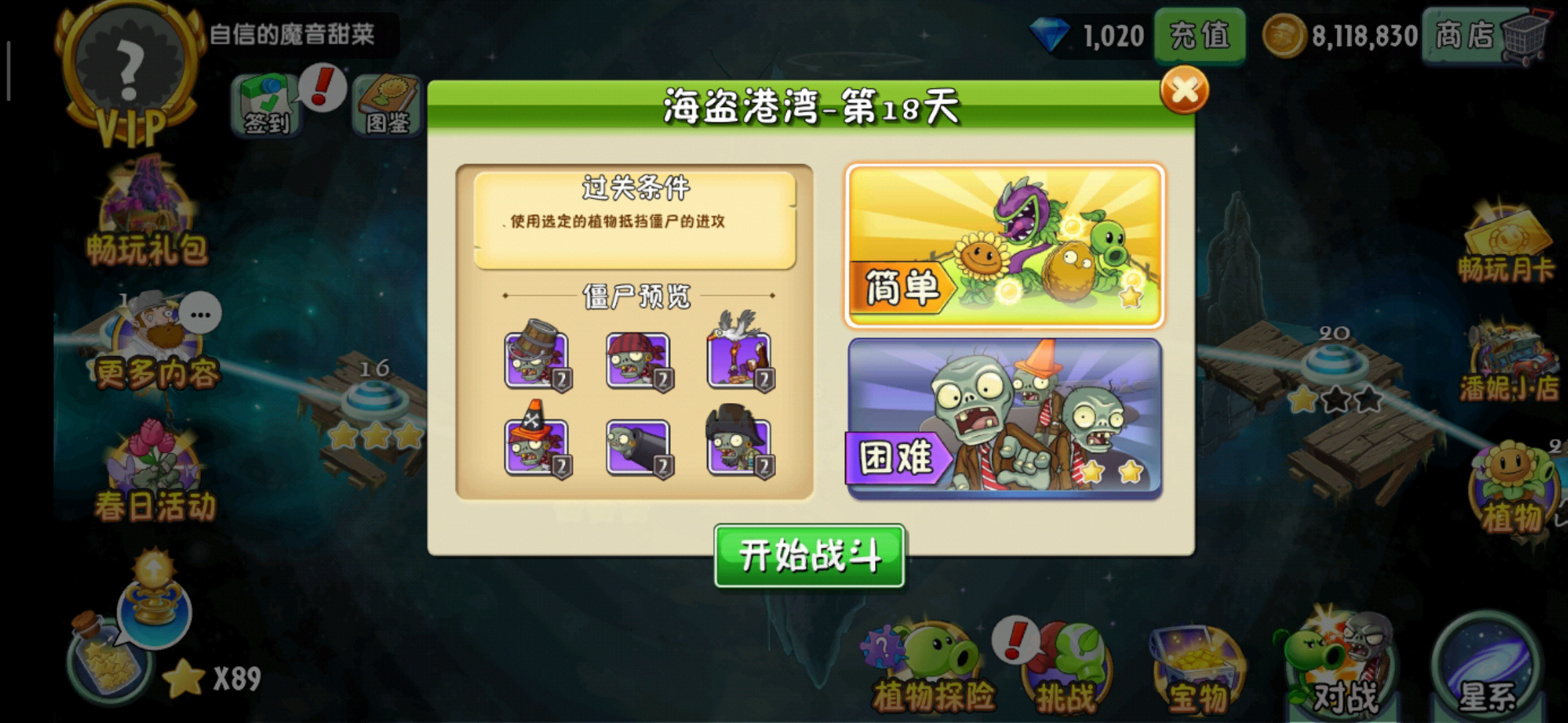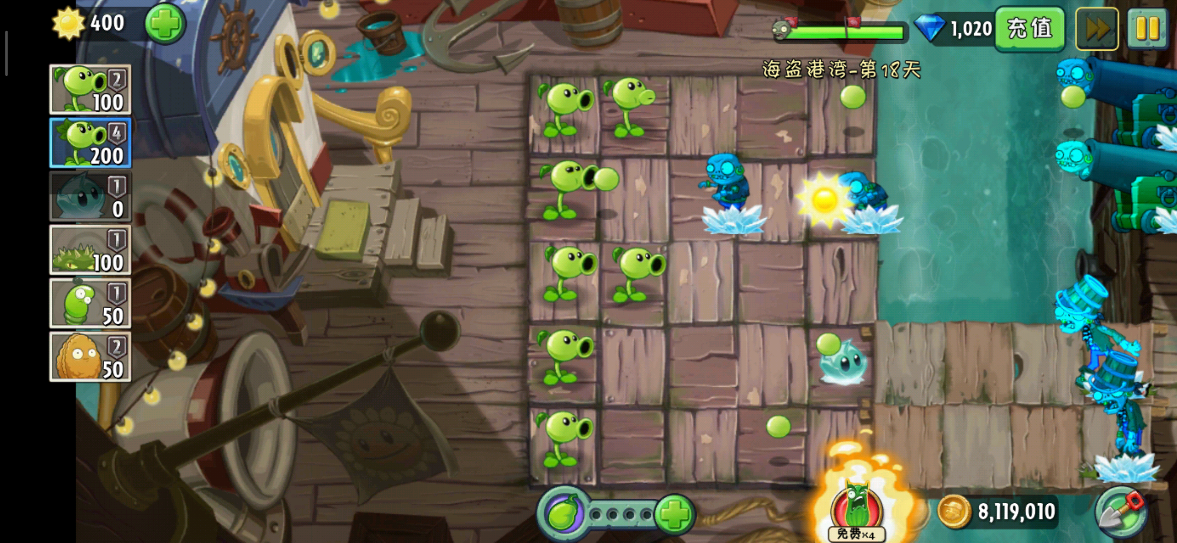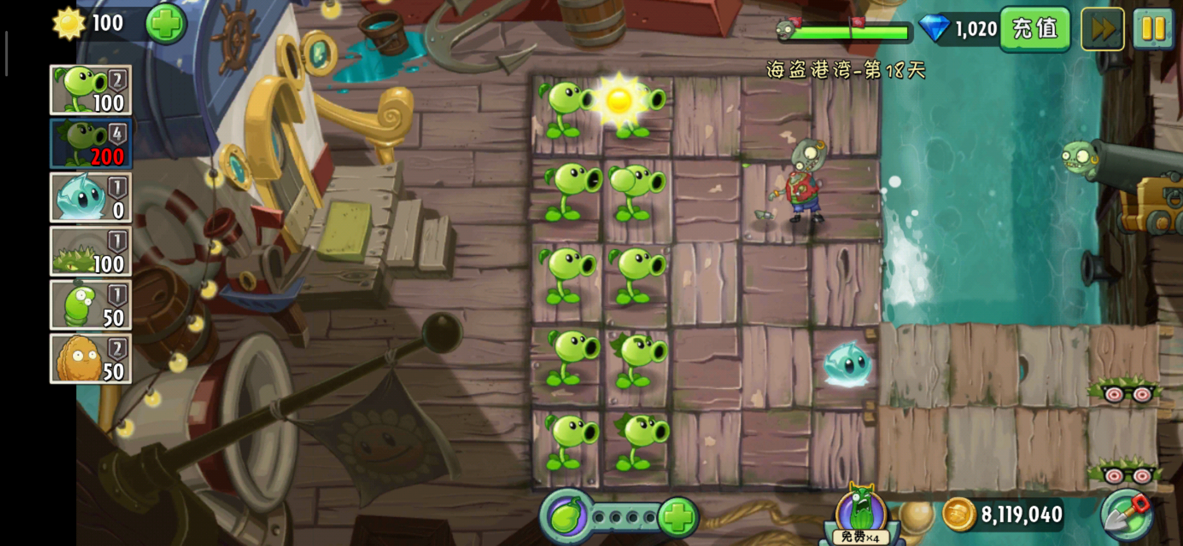 第十八天系统给的植物是地刺、冰冻生菜、弹簧豆、坚果、豌豆射手、双重射手,终于出现了点强势的植物了哈。但是呢,这次的植物跟出场的僵尸的相性可以说是差到了极点。登场的僵尸有普通僵尸三兄弟(普通海盗僵尸、路障僵尸、铁桶僵尸),海鸥僵尸、飞索僵尸、小鬼僵尸炮。看到了海鸥僵尸和飞索僵尸我们就知道了冰冻生菜和地刺基本是没啥用了。而关卡自带的植物又没有玉米投手,而且没有向日葵,只能靠天吃饭,情况可谓是恶劣到极点了。