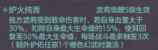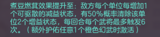强化命魂光环的效果,限制对方的输出。此效果的上下限差距很大,覆盖面不广,首先是限制条件比较多,仅针对奇数回合的前排武将,其次是仅有35%概率生效,但是条件对应着强度,对于非普攻系武将(关兴为代表),一旦生效,几乎是生吞了这部分的伤害。总体来说,此效果碍于限制条件的苛刻,综合性能不足预期。