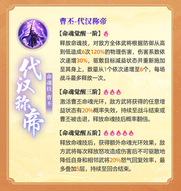 强大的异常系技能,伤害层面,虽然系数可圈可点,但是曹丕本身不是直伤型输出武将,自身资质无法有效利用系数,只能说聊胜于无,能打出一定输出。