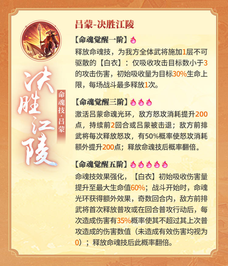 将主动命魂技的数值提高,不过不像吕蒙的翻倍提高,数值上仅仅提高50%,但是将额外效果的生效门槛大大降低,低血量武将也可以享受增益,增加了技能稳定性。