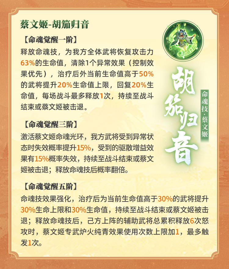 根据前文总结,蔡文姬命魂技延续了其具有普适性的特点,但是技能强度受到了限制,可能源于幻武技能十分优秀(这也是蔡文姬是真正的常青树的重要原因),觉醒蔡文姬也可以作为保命组件融入各种队伍中,无论是五子、后宫、女团、突击队,都可以加入并蔡文姬,依然是一个万能武将。