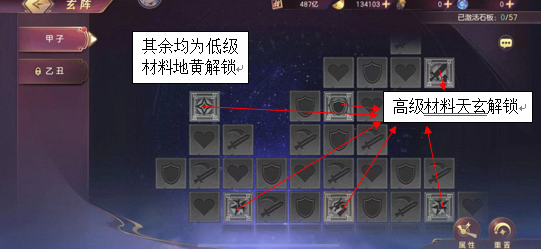 消耗材料激活石板获得属性加成,规则如上图示意,需要注意,高级石板激活除了需要消耗高级材料天玄,还需要先激活至少一块相邻低级石板。