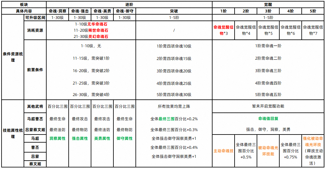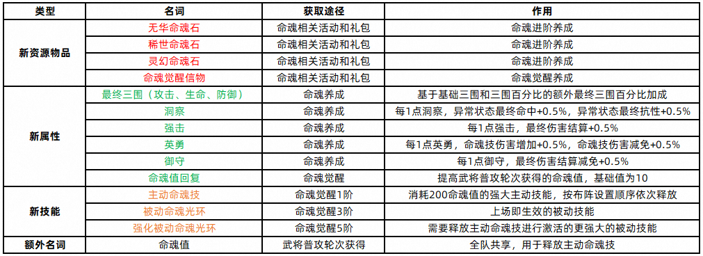 首先笔者列出了命魂养成系统一览表,命魂养成系统分为进阶和觉醒两部分,表中对首次出现的小将军可能有疑问的名词标注了颜色,红色代表新资源物品,绿色代表新属性,橙色代表新技能,可配合后文解释食用。