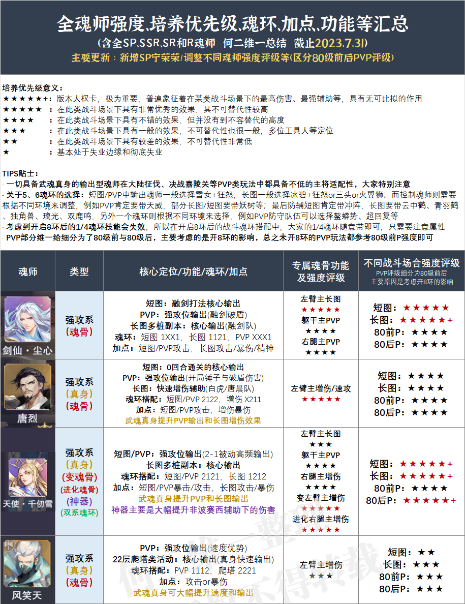 所以考虑到如此此类的案例还有很多,因此此次的汇总攻略维一也是把所有SP/SSR魂师的PVP评级给细分为了80级前和80级后,反正大家按照自己的游戏进度来参考即可,另外即使部分朋友已经达到了80级后,但由于现阶段的全民对决玩法也是没有超过79级的,因此对于这部分玩法大家也可以直接参考80级前P的强度即可,特此说明。