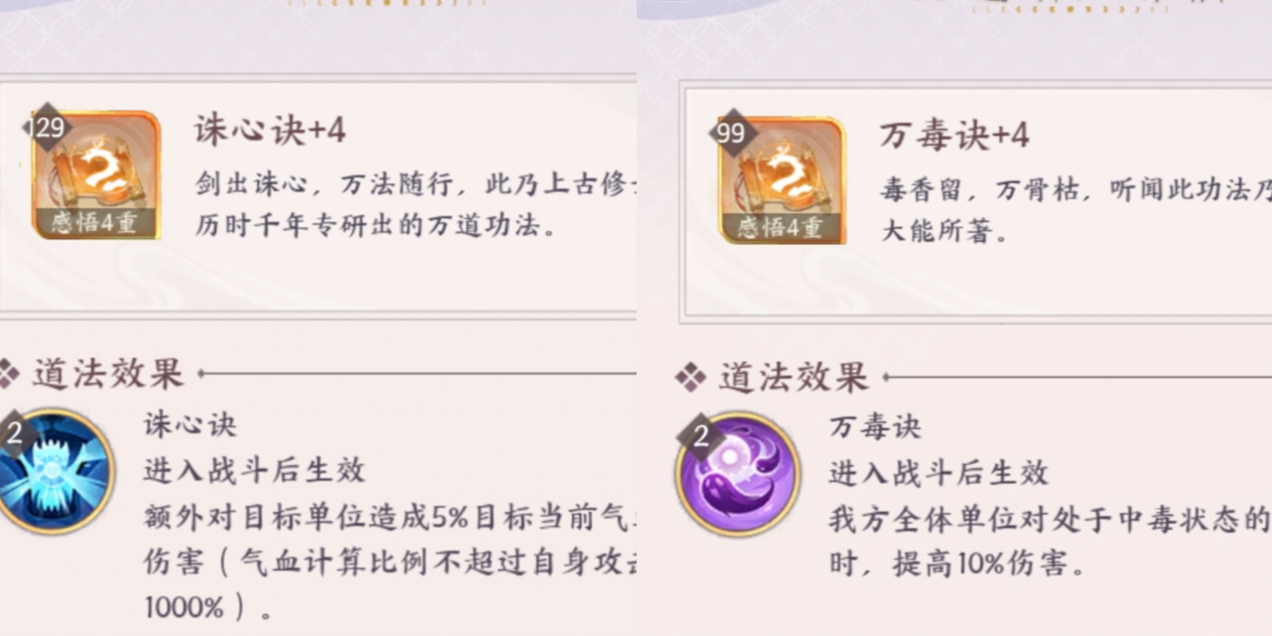 比如攻击类的道法书:佩戴了诛心决+万毒决以后,就无法继续佩戴其他的道法书了。
