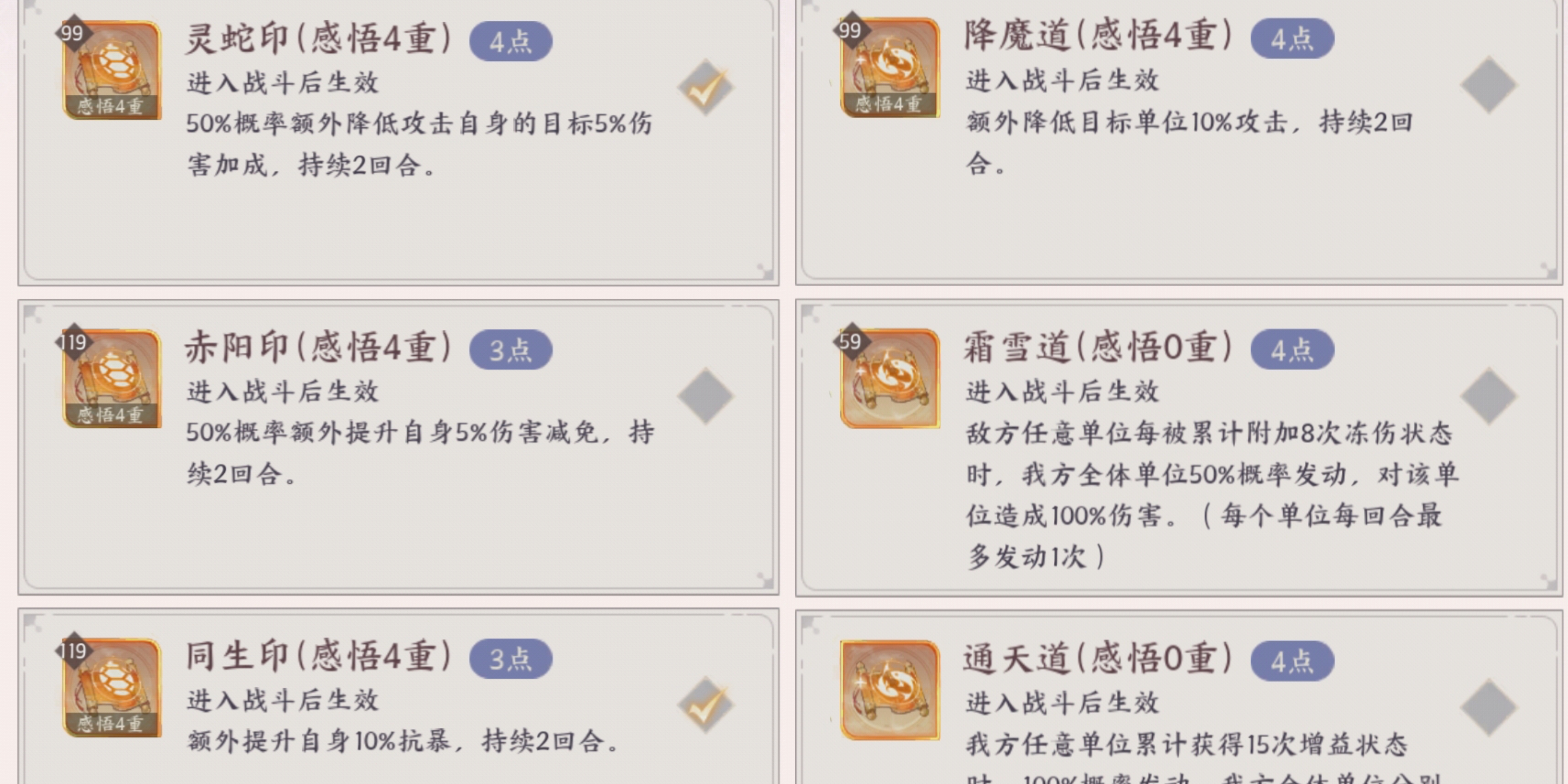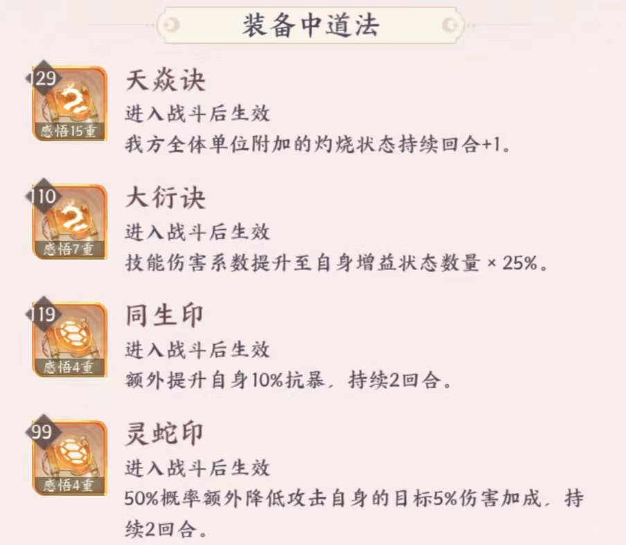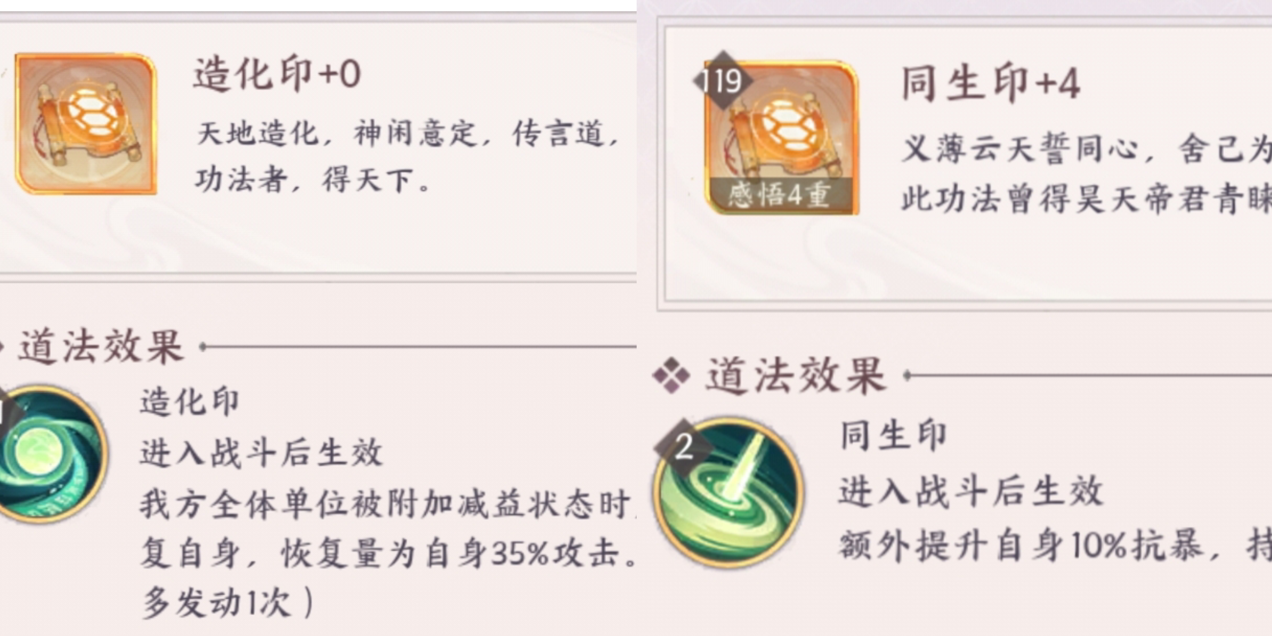 解锁2层道法书以后,优先选择【造化印】搭配。造化印我方只要被附加减益效果,就有几率恢复高额的生命,很适合当前的阵容环境。